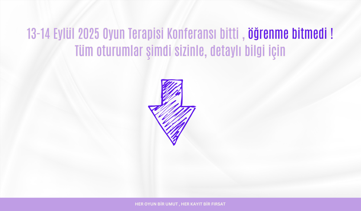 13-14 Eylül 2025 Oyun Terapisi Konferansı bitti ancak konferansın tüm kayıtlarını bağış ya da katkı payı karşılığında satın alabilirsiniz. Kayıtlar, erişim sağladığınız tarihten itibaren bir ay boyunca erişime açık olacaktır.